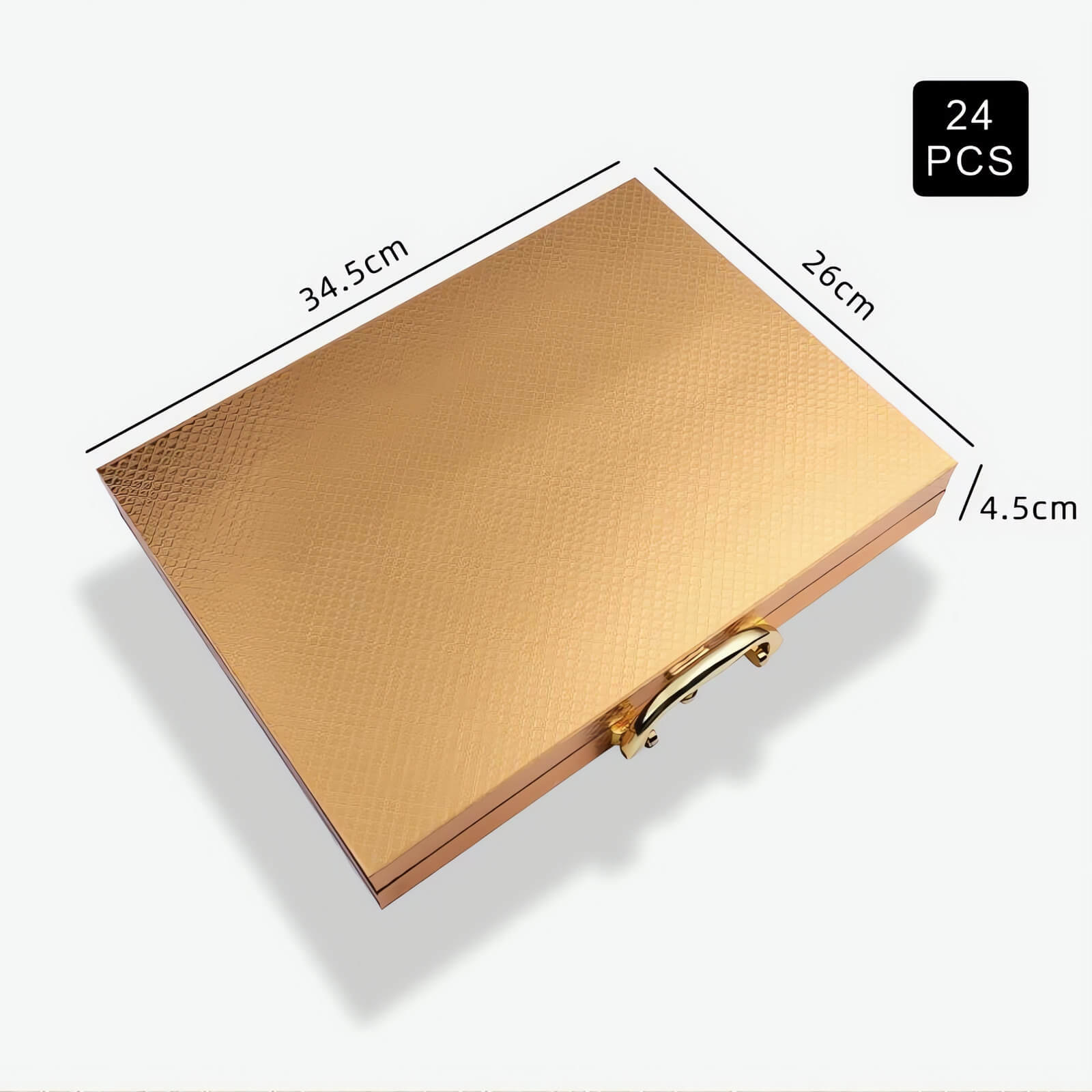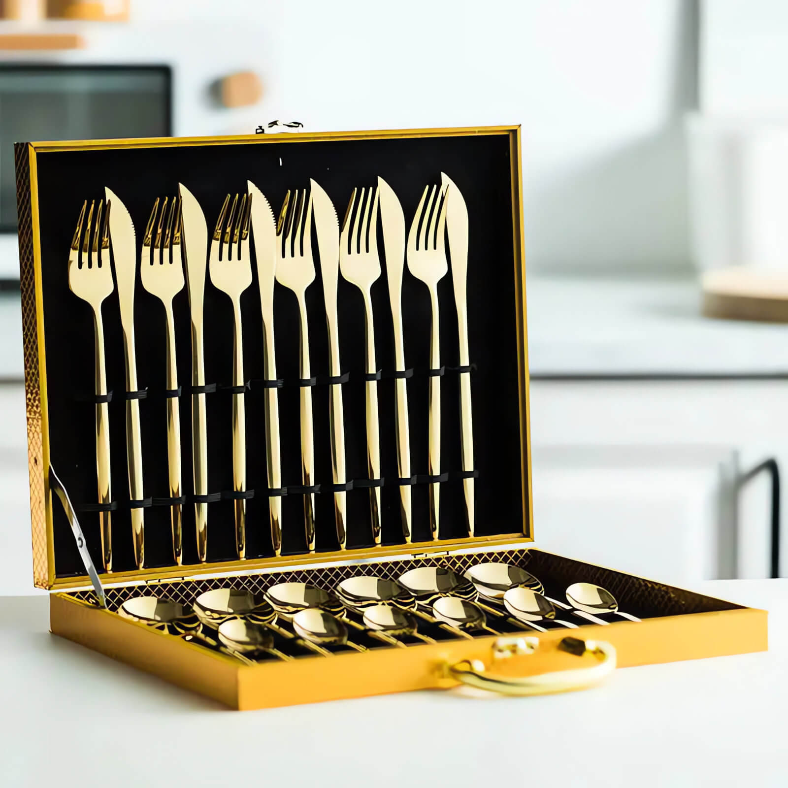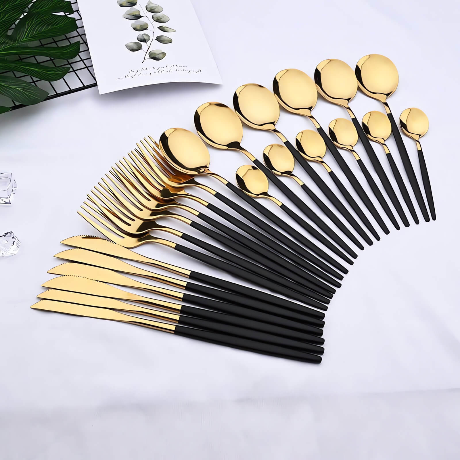 The 24-Piece Premium Stainless Steel Cutlery Set is perfect for decorating your beautifully set table. For a more personal touch, choose between Gold, Black, or Rose Gold. The luxury carrying case is an excellent option to further enhance your choice, whether for personal use or as a gift for someone special.