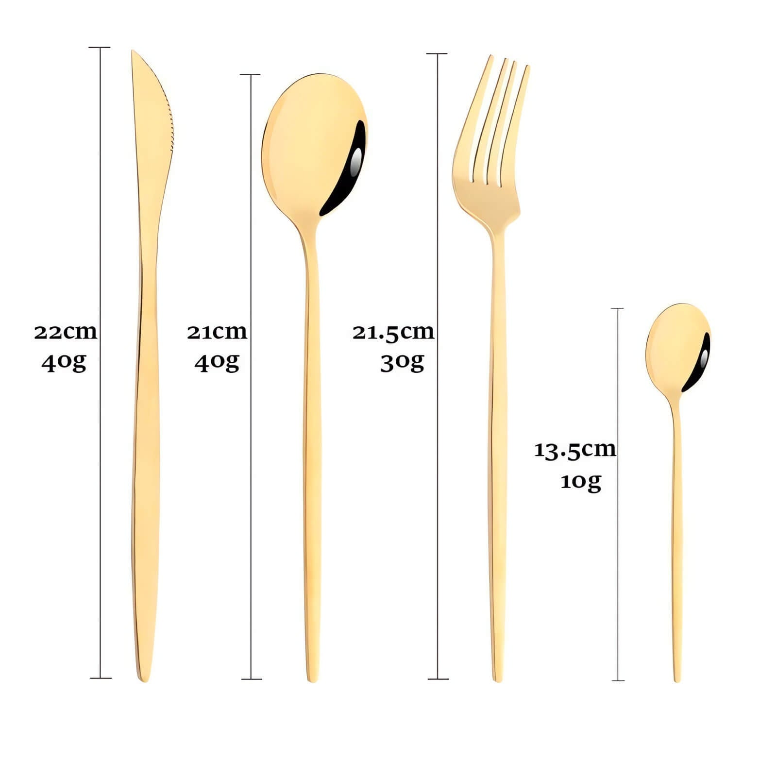 • 24-piece cutlery set: 6 knives of 22cm/40g + 6 forks of 21.5cm/30g + 6 soup spoons of 21cm/40g + 6 teaspoons of 13.5cm/10g;