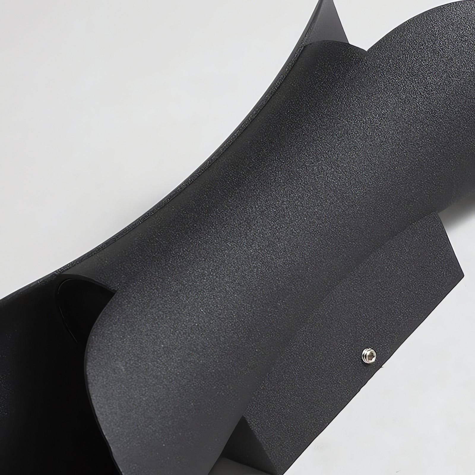 Applique murale d’extérieur au format compact, au dessin graphique mêlant courbes et lignes. La lumière se projette vers le haut et le bas pour souligner les volumes d’une façade ou d’un passage, avec une présence discrète et contemporaine.