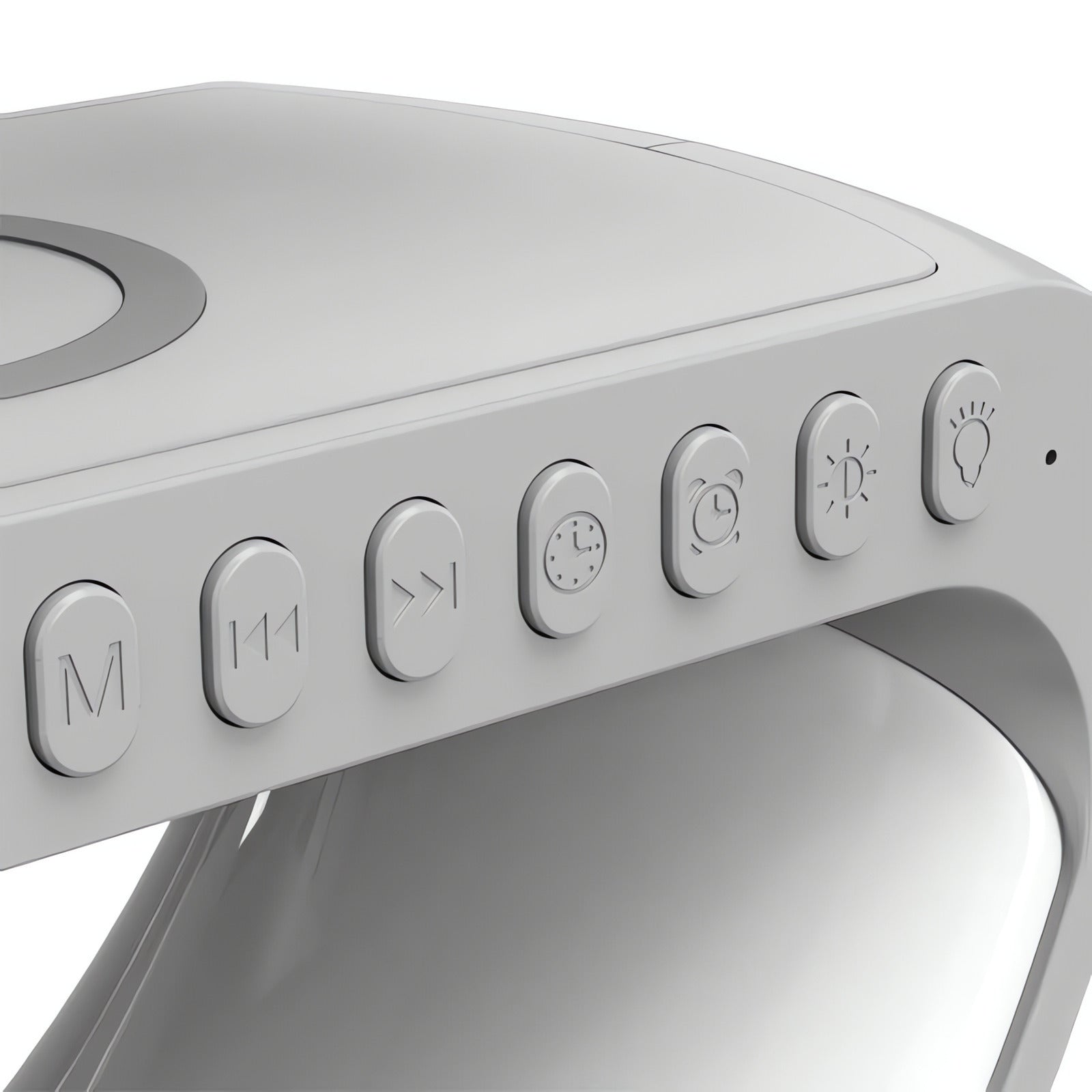 • Fonctions : charge sans fil (norme Qi), réveil et horloge numérique avec alarme, lampe de bureau, enceinte Bluetooth.
