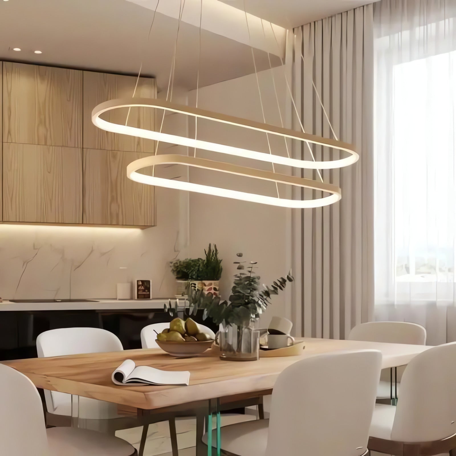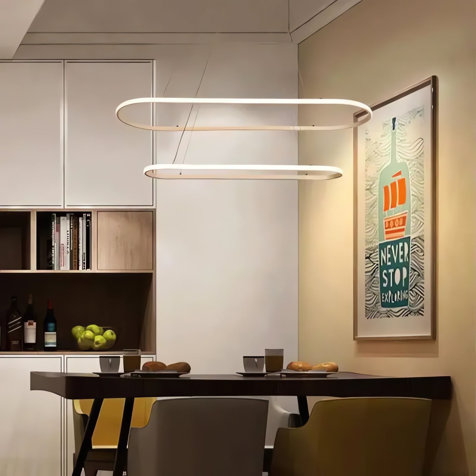 Thanks to the adjustable suspension, the height can be precisely adapted to the room: lower for intimacy above the dining table, higher for space and clean lines in open-plan living areas. Its minimalist design remains light and elegant.