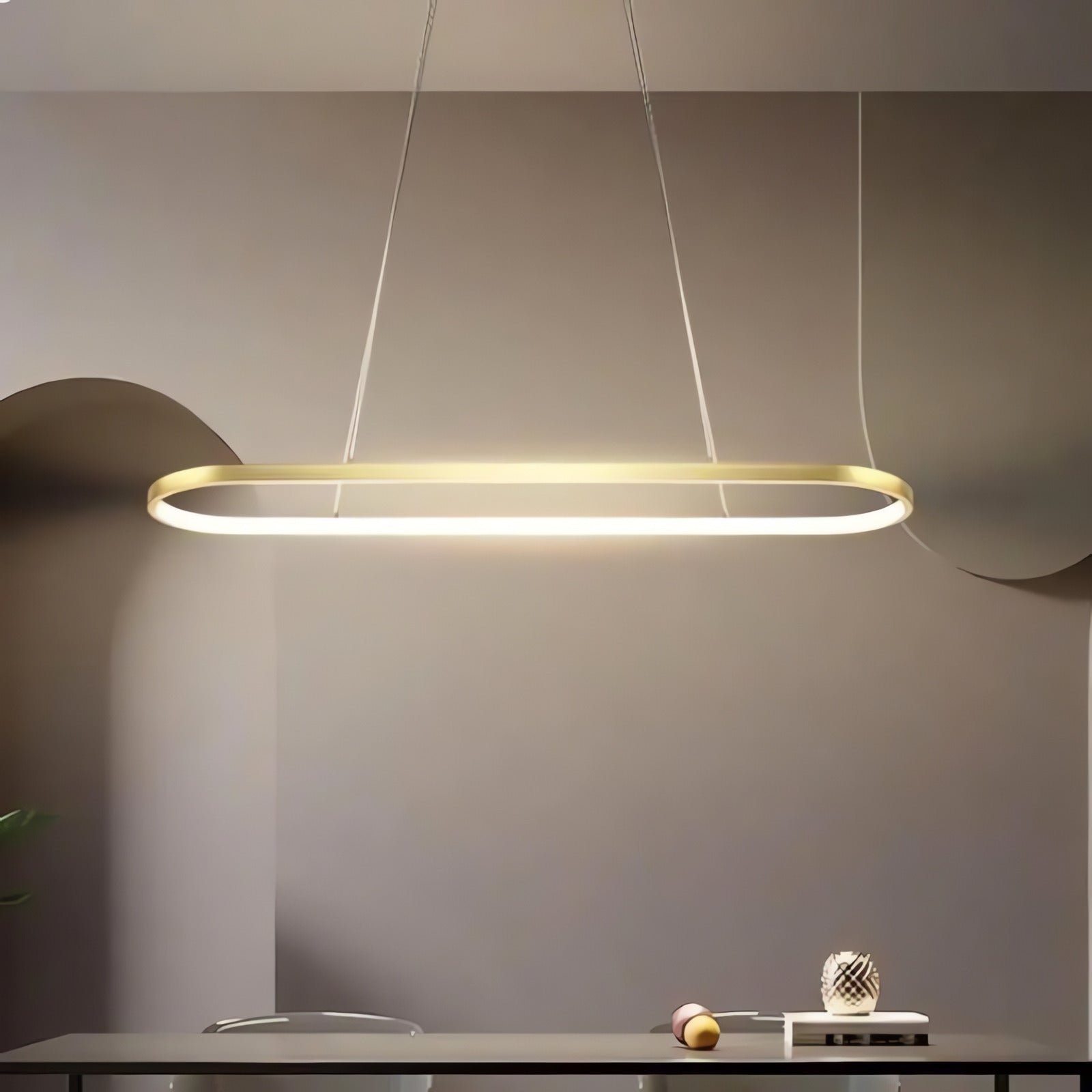 The Homysia gold pendant lamp is a luminous statement piece for modern rooms. With its clean lines and subtly reflective surface, it brings warmth, tranquility, and understated refinement to your interior. Whether above the dining table, in the living room, bedroom, or entryway, this light fixture emphasizes calm and enhances any setting with timeless elegance.